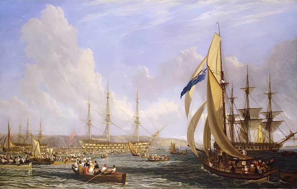 At around 6:30 am, Napoleon pulled alongside Bellerophon. He had been transferred to Bellerophon's own barge to hasten his arrival.