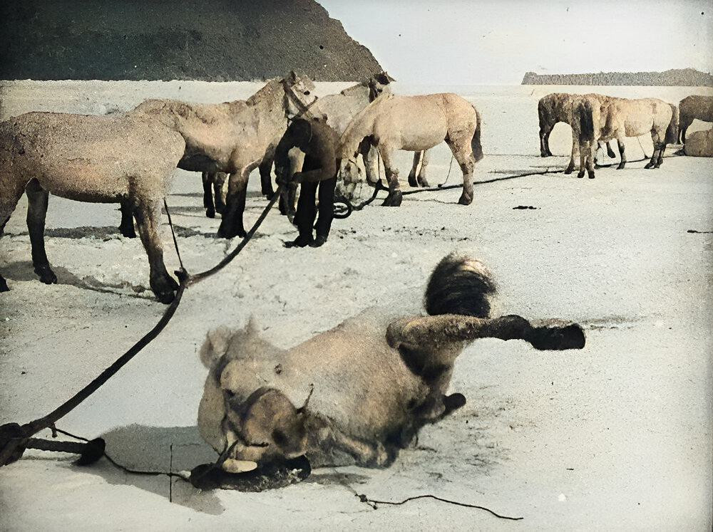 Although Amundsen's Norwegian team used dogs exclusively, Scott's team relied on ponies to do much of the hauling, which were ill-suited to work on snow and ice without snow-shoes.